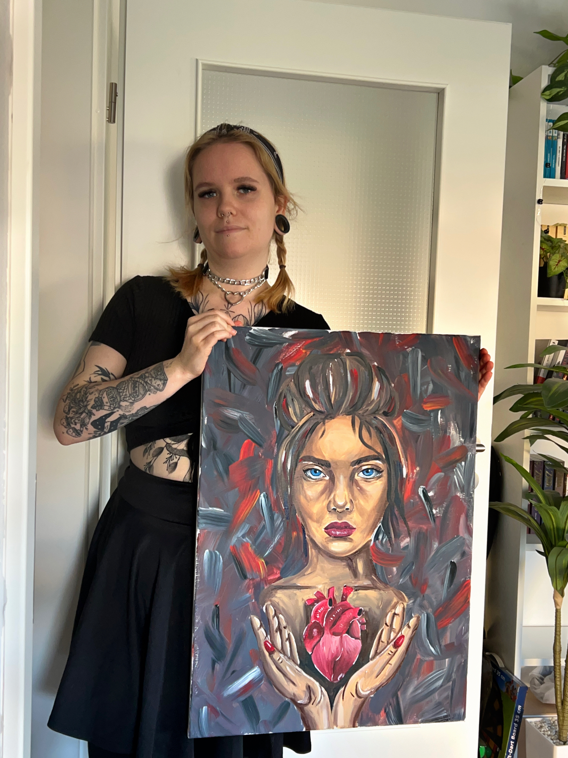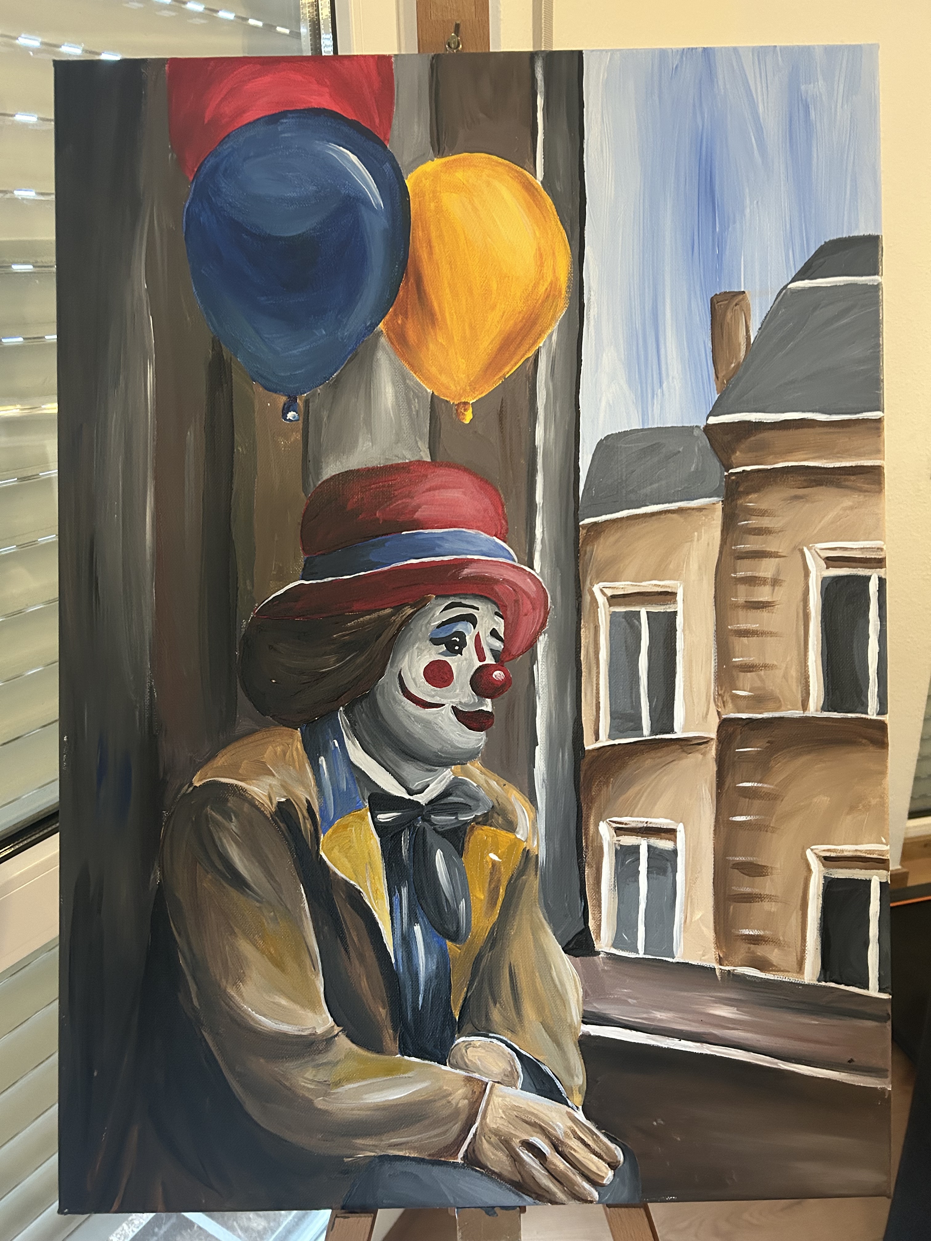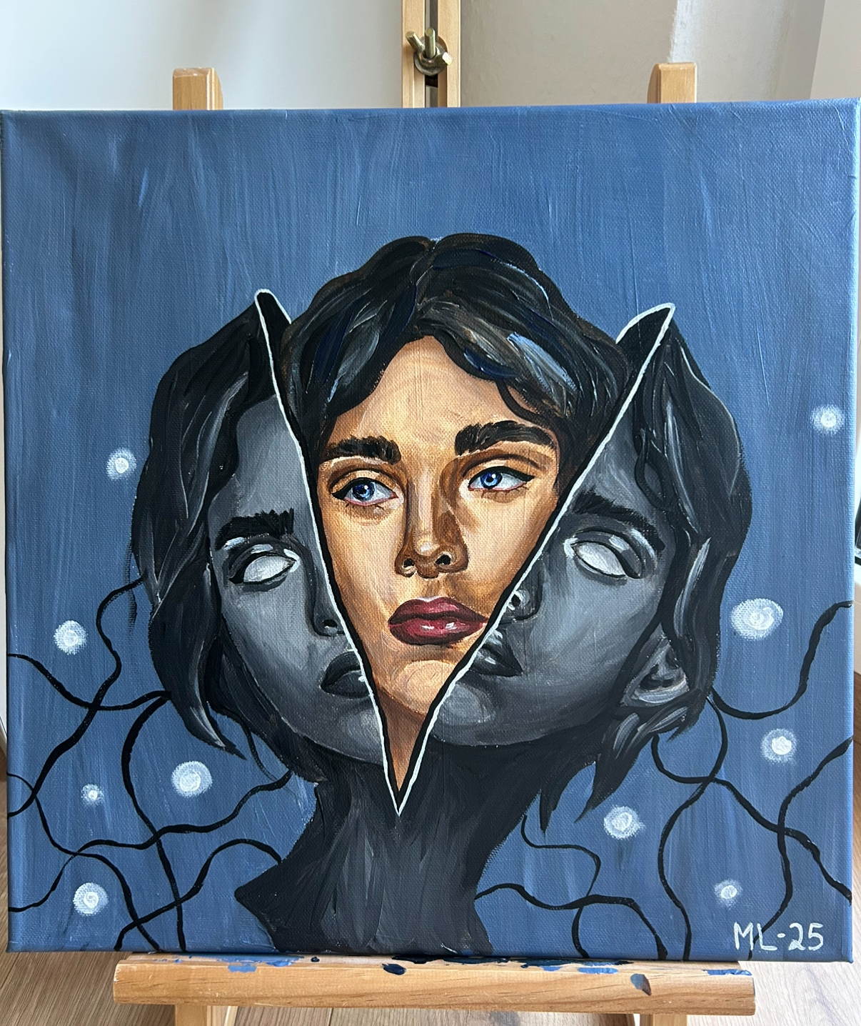 In den Augen der meisten Künstler habe ich vermutlich eine falsche Herangehensweise bei Malen dieses Bildes. Ich habe mal gelernt, man soll zuerst den Hintergrund malen, weil neben einem weißen Hintergrund alles viel dunkler aussieht. Also wenn ich zuerst das Porträt male und dann den Hintergrund, werde ich feststellen, dass mein Porträt vermutlich viel zu hell ist. Und teilweise wird das auch stimmen. Aber irgendwie habe ich bei diesem Bild zuerst die Frau gemalt und am Ende wirkte es zum Glück trotzdem stimmig. Aber ja, in der Theorie weiß ich, dass es Andersherum eigentlich besser ist.