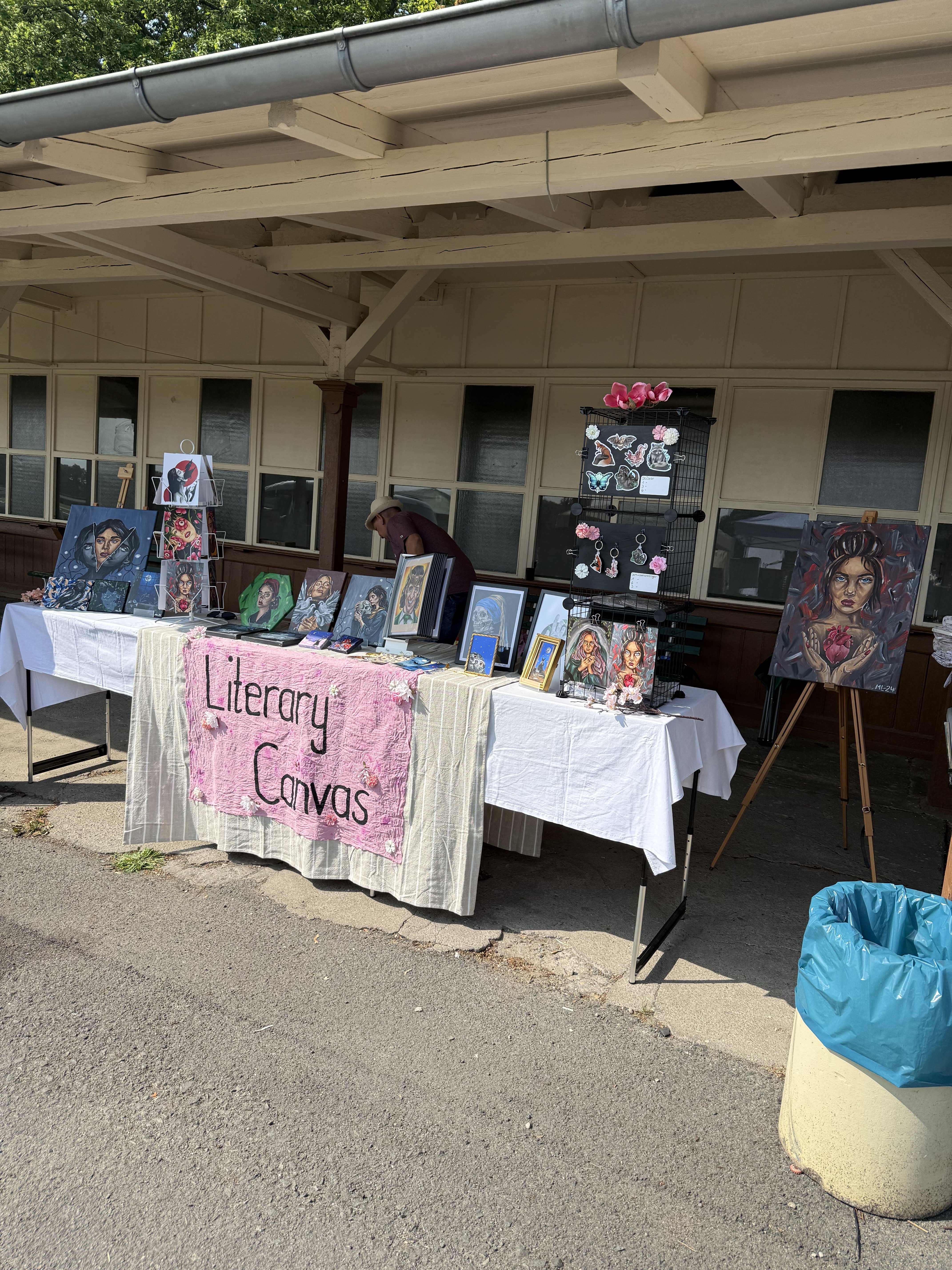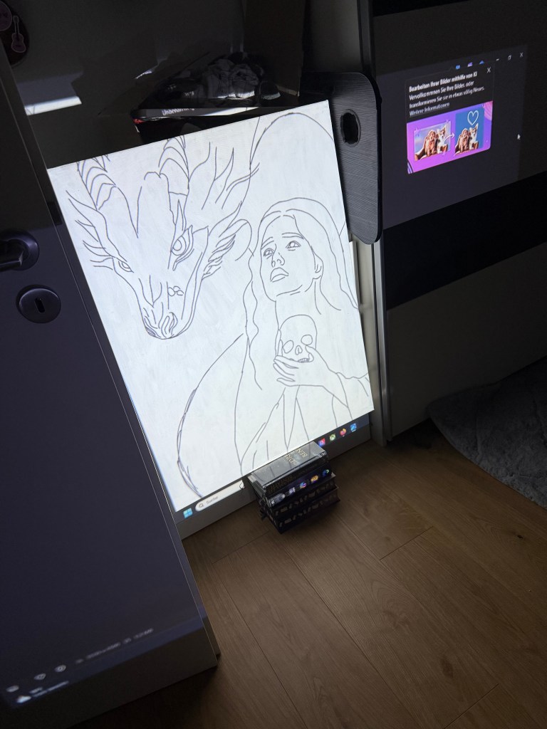 Meist mache ich meine Skizzen zuerst digital auf dem iPad. Je nachdem, um welches Motiv und welche Größe es sich handelt, male ich diese dann entweder ab oder übertrage diese mithilfe von Kohlepapier auf meine Leinwand. Da diese Leinwand doch nochmal eine Nummer größer war, habe ich mir einen ganz einfachen Beamer gekauft und meine Skizze damit übertragen und einfach nachgemalt.