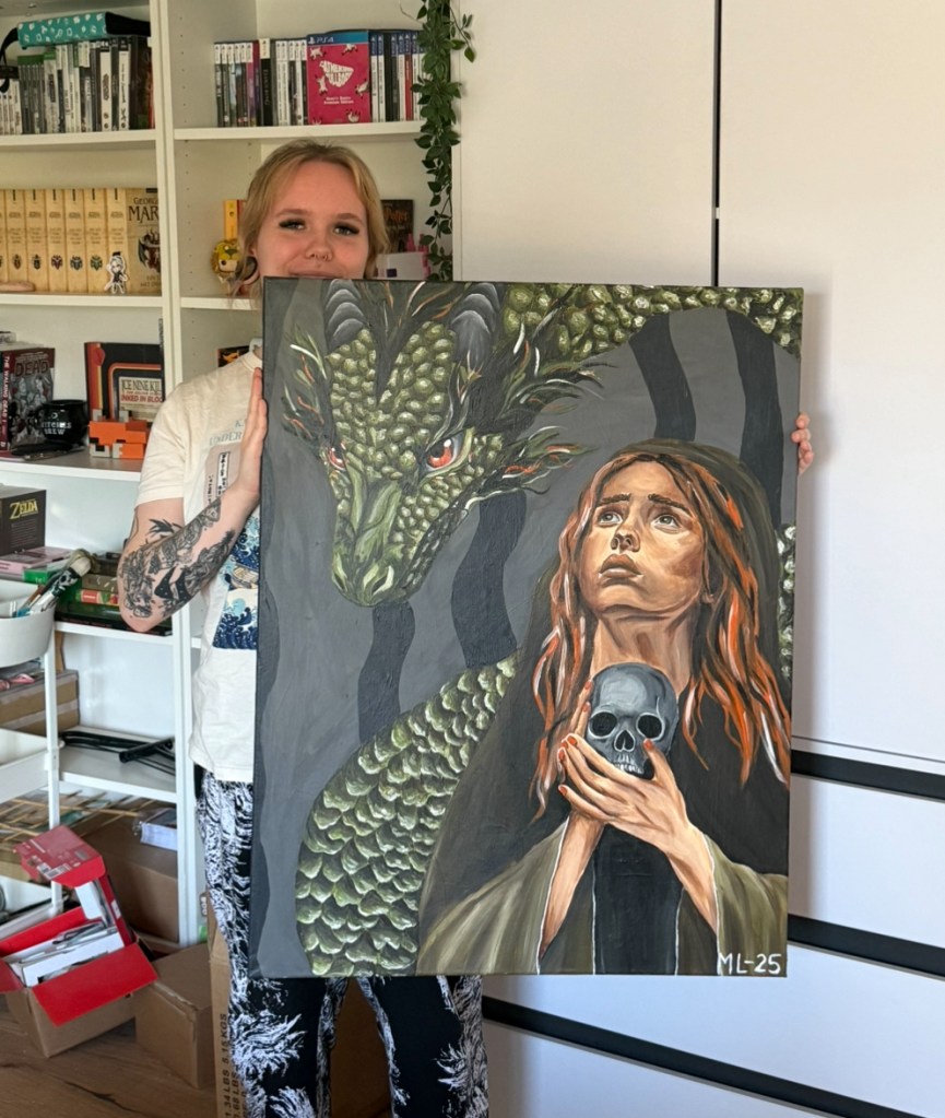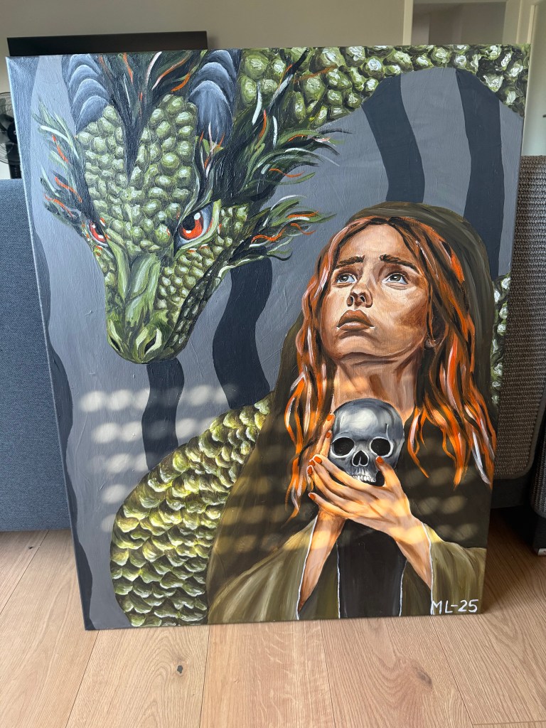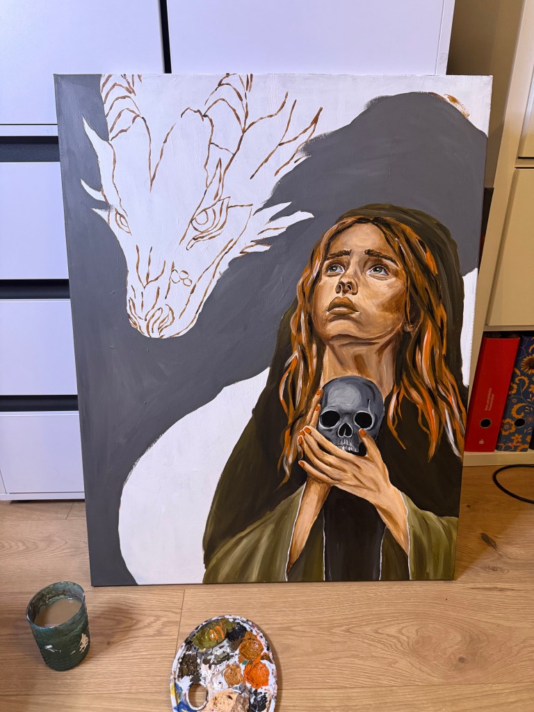 Die Frau zu malen war für mich kein großes Problem. In den letzten Jahren habe ich einfach sehr viele Portraits (seit etwa einem Jahr auch aktiv Acryl-Portraits) gemalt, dass dies für mich mittlerweile fast Routine ist. Auch die Größe störte mich hierbei nicht wirklich. Eigentlich ist es nichts anderes, als wenn man ein Porträt auf A4 Format malt, nur eben größer. Bei dem Drachen sah das ganze schon etwas anders aus. Ich liebe liebe liebe Drachen. Aber einen malen? Das habe ich mich bisher noch nicht getraut. Mein grober Ansatz war dann: ich habe vor einigen Jahren mal mit Buntstiften 2 sehr detaillierte Schlangen gemalt, ich orientiere mich jetzt einfach daran, was soll schon schiefgehen….. Während ich die Frau innerhalb von 3 Tagen gemalt habe, habe ich am Drachen dann knapp 2 Wochen gesessen. Ich habe etwas unterschätzt, wie unglaublich aufwendig es wird diese ganzen einzelnen Schuppen zu malen. Aber hey, genau deswegen wollte ich unbedingt größere Bilder malen. Auf kleinerem Format ist es nunmal kaum möglich solche Details darzustellen.